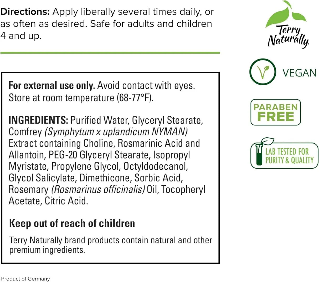 Ingredients: Purified Water, Glyceryl Stearate, Comfrey (Symphytum x uplandicum NYMAN) Extract containing Choline, Rosmarinic Acid and Allantoin, PEG-20 Glyceryl Stearate, Isopropyl Myristate, Propylene Glycol, Octyldodecanol, Glycol Salicylate, Dimethicone, Sorbic Acid, Rosemary (Rosmarinus officinalis) Oil, Tocopheryl Acetate, Citric Acid.