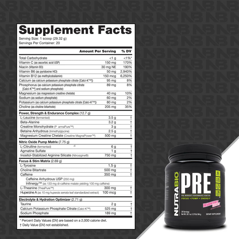 With 350mg of caffeine flowing through your system, you have the ability to push harder than ever during your training sessions without waving the white flag in defeat and surrender. Show no mercy on the weights and stand your ground, thanks to NutraBio PRE!