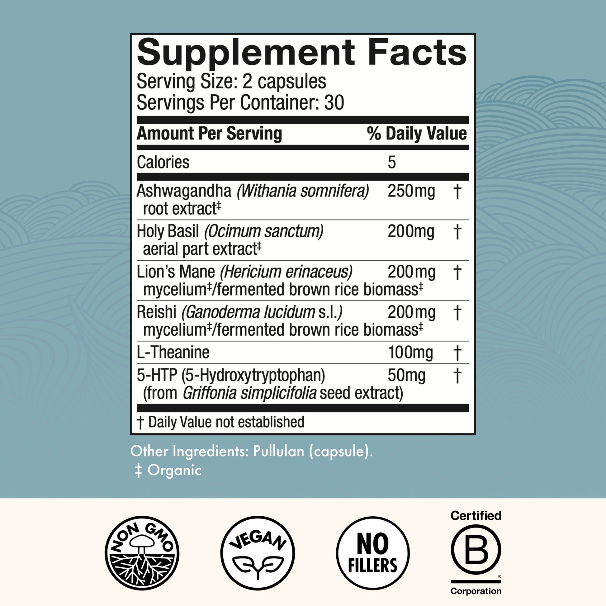- Supplements with Reishi: Our blend of Reishi, Lion’s Mane, Holy Basil, L-Theanine, and Ashwagandha supports stress resilience, a balanced mood, and calm thinking.*