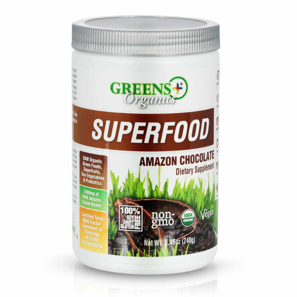 One serving delivers more vitamins, minerals, and antioxidants than 7 servings of fresh fruits and vegetables while supplying every color in the Dietary Food Spectrum. With a high-ORAC* superfruit blend and 2500mg of raw & organic cacao beans, Greens Plus Organic Superfood Amazon Chocolate helps to promote: