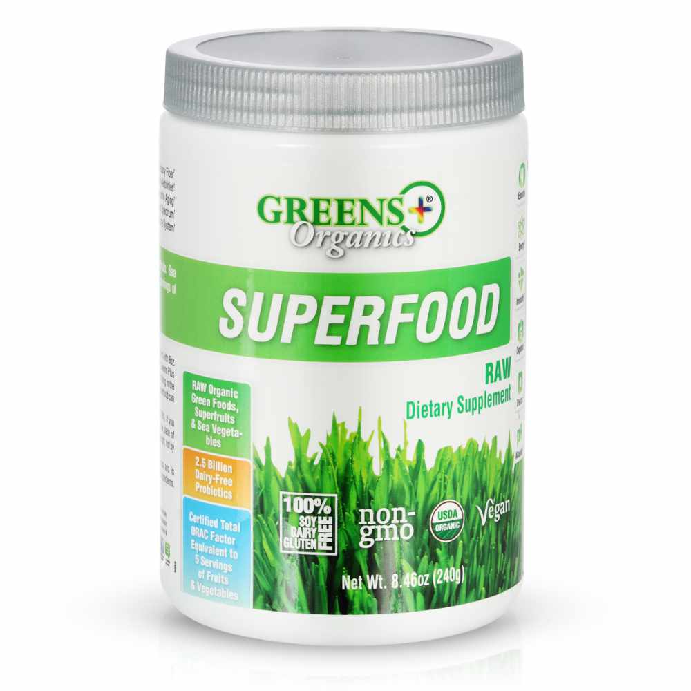 One serving of Organic Superfood Raw delivers more vitamins, minerals, and antioxidants than 4 servings of fresh fruits and vegetables. As a powerful antioxidant plus 2.5 billion dairy-free probiotics, Greens Plus Organic Superfood Raw helps to promote:
